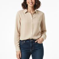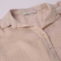 این مدل با رنگ بژ روشن/کرم و بدون چاپ یا گرافیک، ظاهری ساده و شیک دارد. برش هلالی در پایین لباس، یوغ پشت بههمراه یک چین عمودی و دکمههای همرنگ جلو، جلوهای مرتب و زنانه به شومیز بخشیدهاند. یقه برگردان کلاسیک نیز ظاهر رسمیتری به آن میدهد.